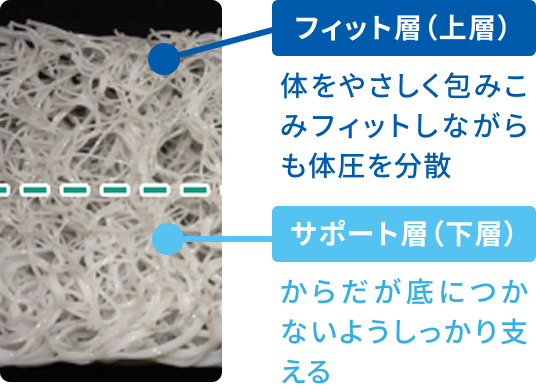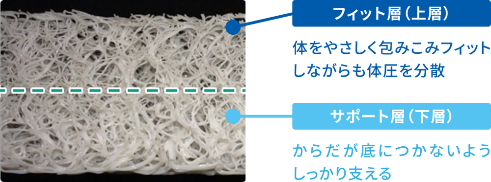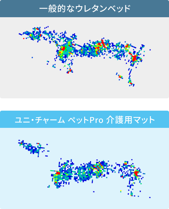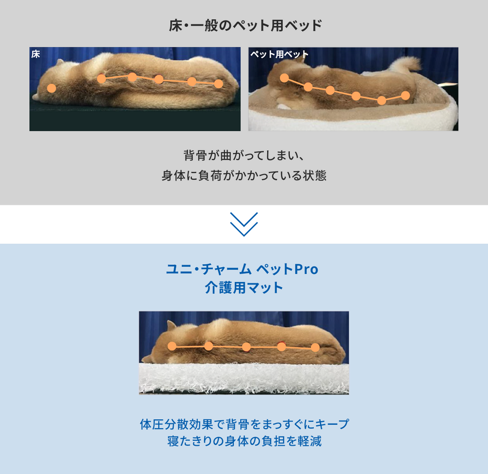 体圧を分散するフィット層としっかり支えるサポート層で固さや密度を変えています。製品の性能を十分に発揮するために、「ユニ・チャームペットPro」と書かれた青色のタグを上にして、ご使用ください。
