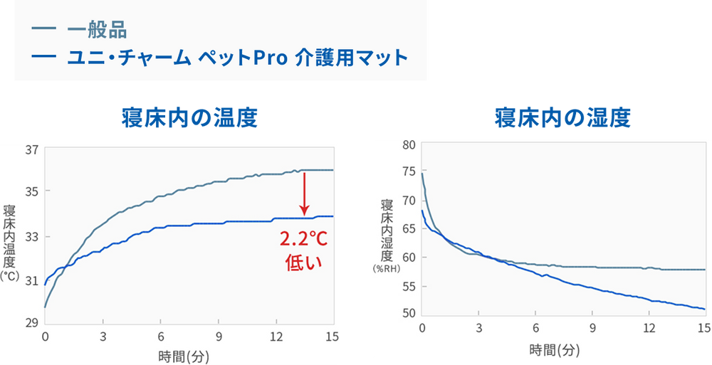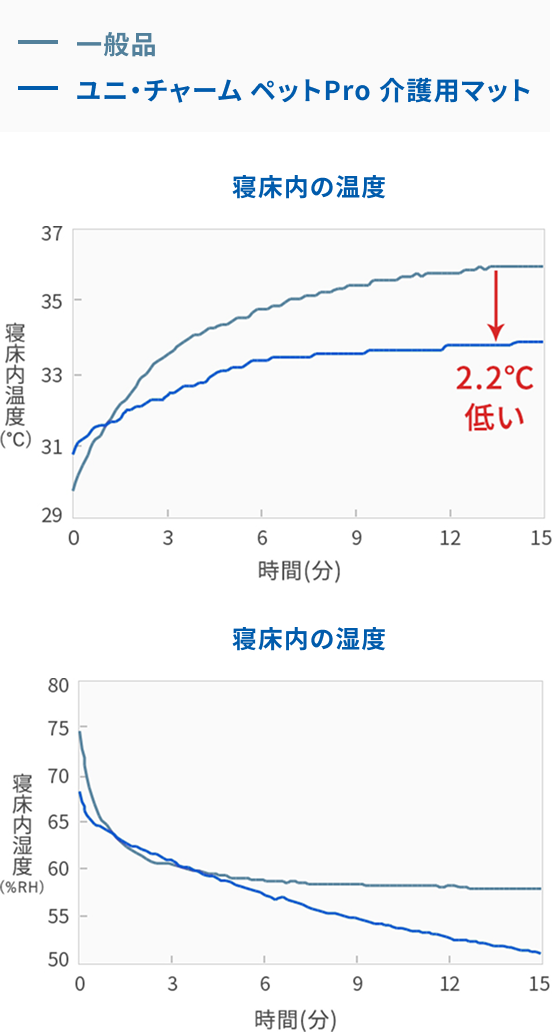 メッシュ構造により、寝床内の温度はウレタンベッドより2℃低く、湿度も抑えてムレにくい環境を実現しました。ペット用ホットカーペットを併用した場合、暖かい空気をマット内に含むため、一般的なペット用ベッドに比べて温度が高く、暖かい環境になります。