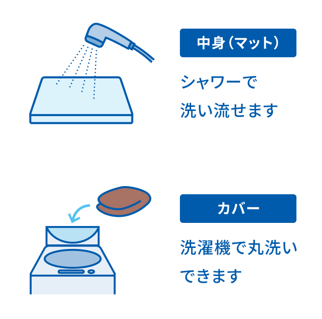 カバーは洗濯機で、本体はシャワーで洗浄可能です。