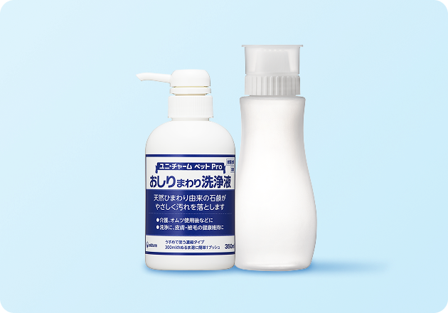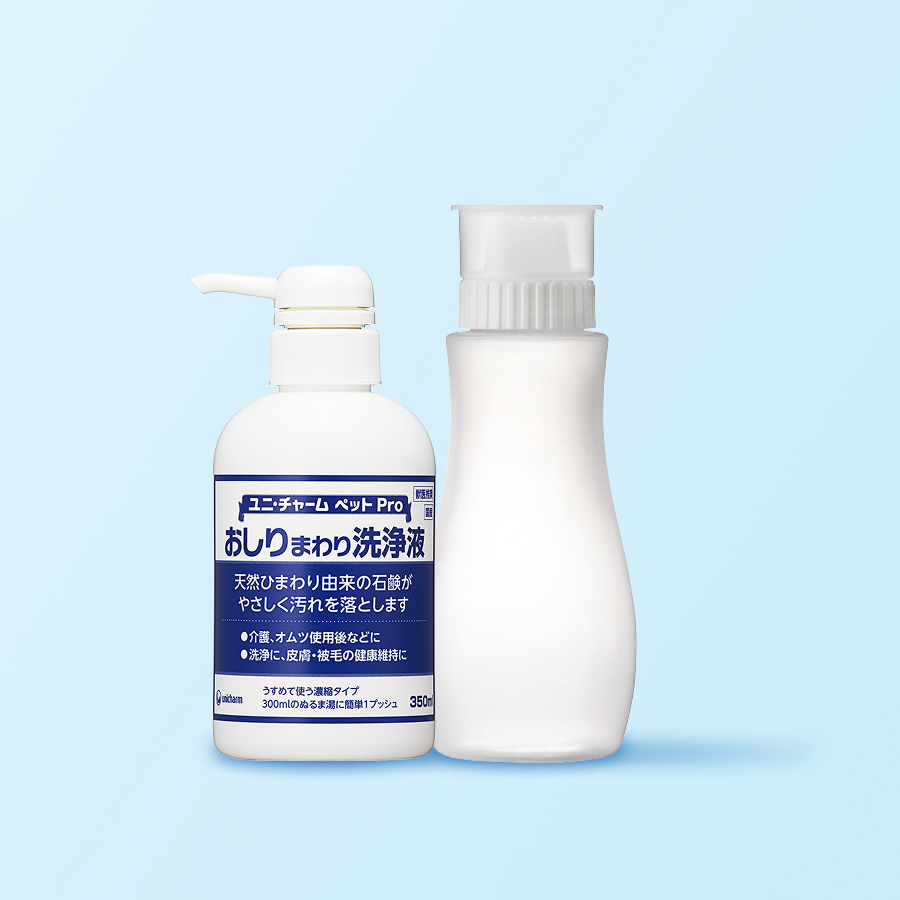 KS Online上で、動物病院より配布される「病院コード」に続けて「kaigo」とご入力すると、おしりまわり洗浄液350ml(希釈ボトルつき)をプレゼント。さらに、介護用マットを通常価格より5%割引いたします。